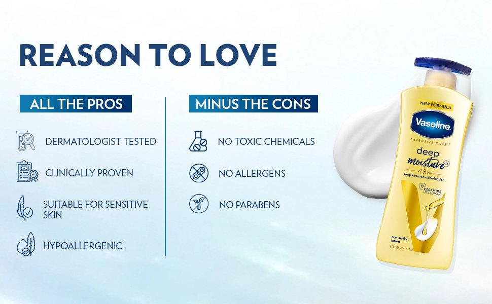 Experience deep hydration with our most advanced moisturising technology In New Vaseline Deep Moisture Body lotion with the new Ceramide-Hyaluron Moisture Fillers. This breakthrough formula is clinically tested to deliver 10X moisturisation, making even the driest skin feel soft and nourished from the very first use.